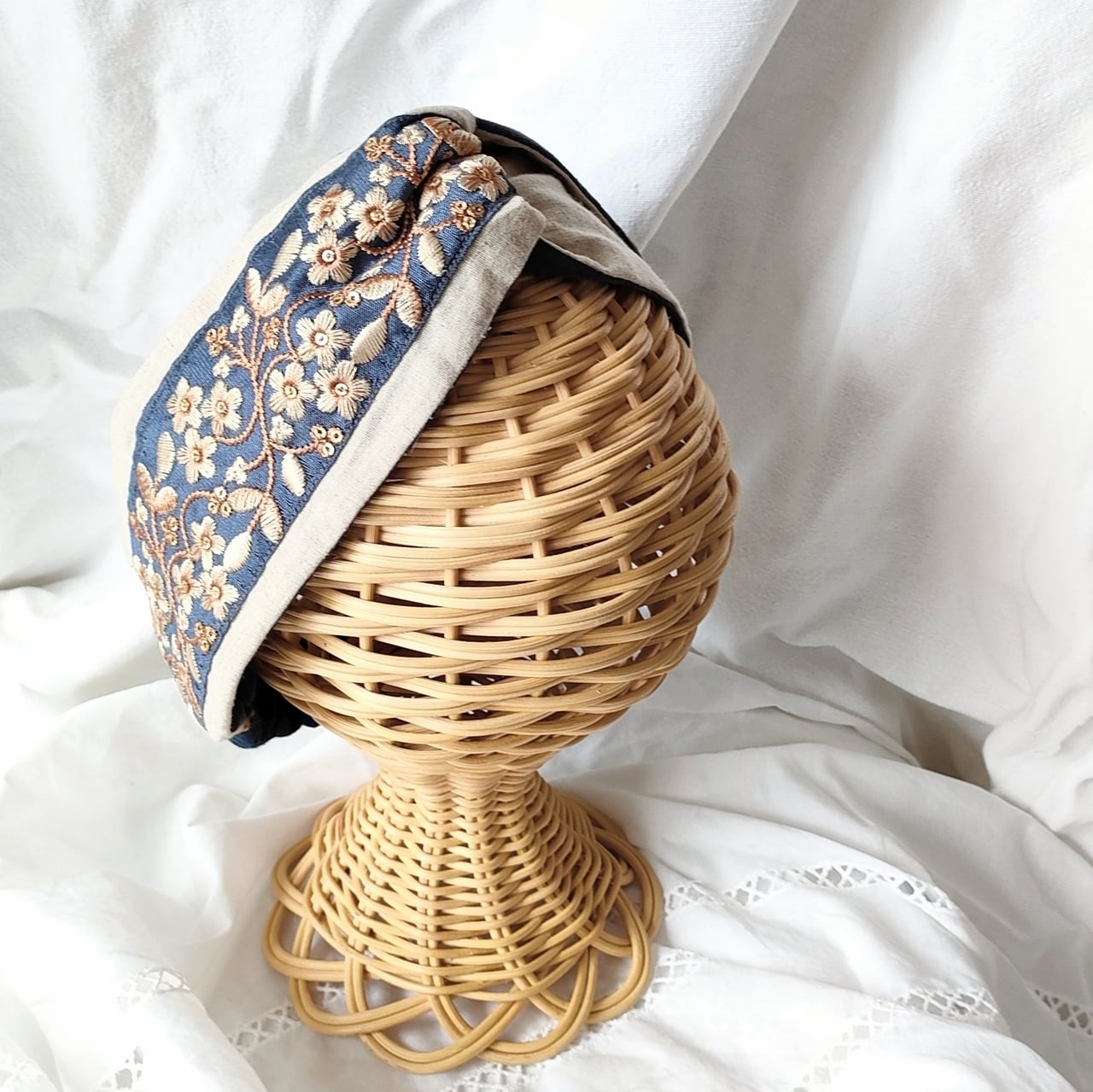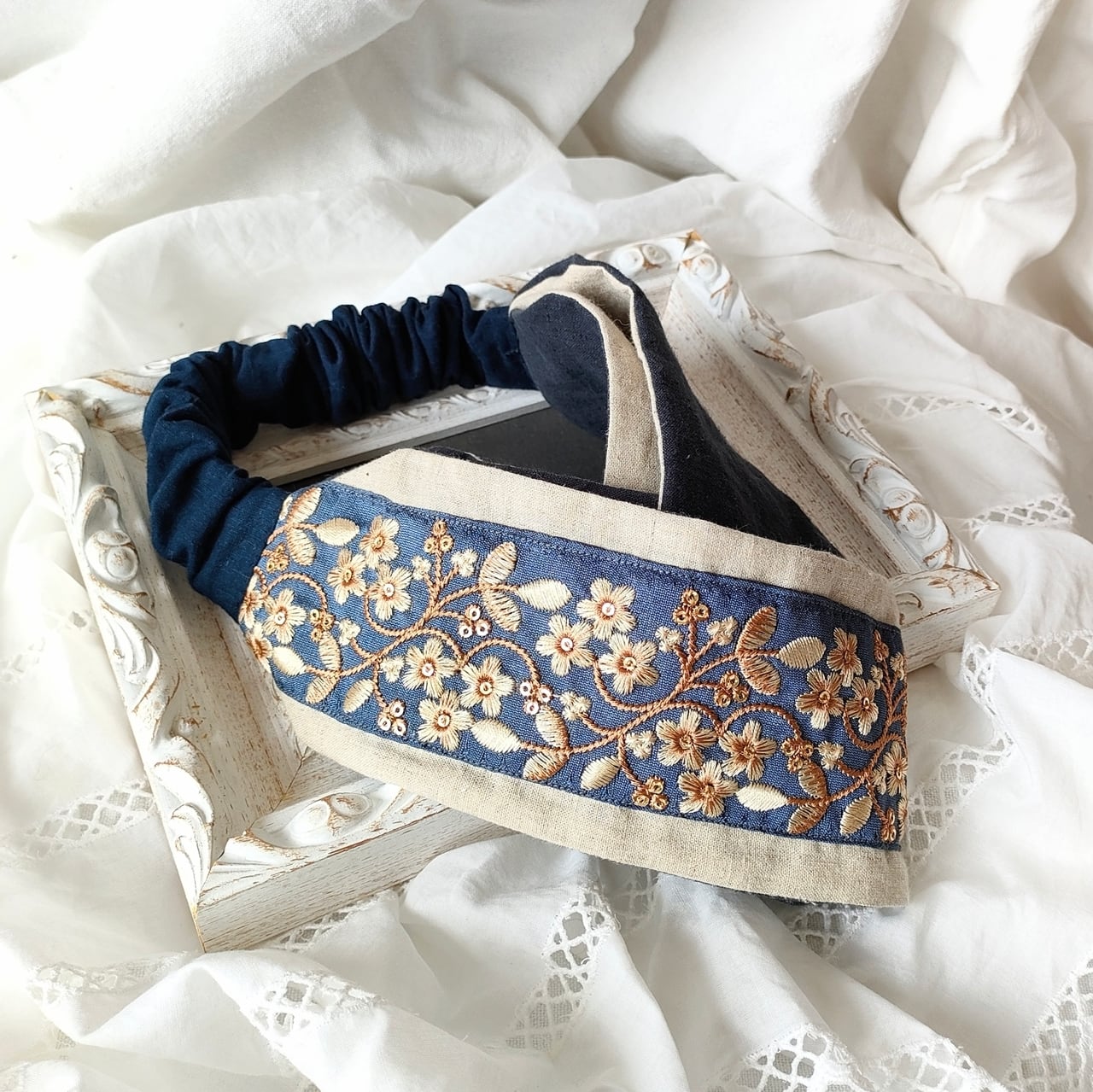 インド刺繍リボンをあしらったヘアバンド。肌ざわりのやさしいコットンリネンを重ねてターバンのような立体的なデザインに仕上げました。細かい部分は手縫いで丁寧に仕上げています。
