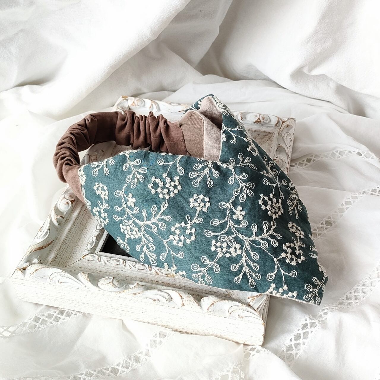 刺繍生地をあしらったヘアバンド。肌ざわりのやさしいコットンリネンを重ねてターバンのような立体的なデザインに仕上げました。細かい部分は手縫いで丁寧に仕上げています。
