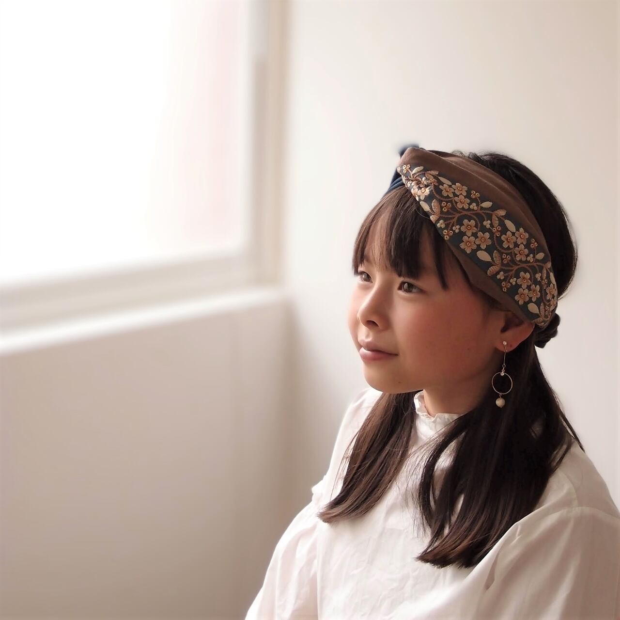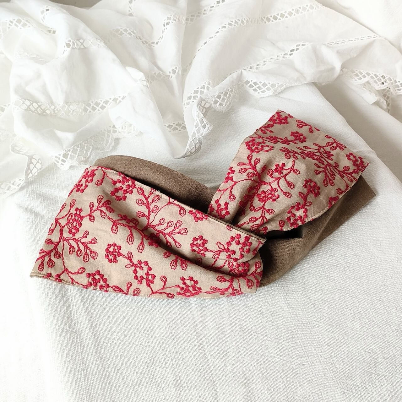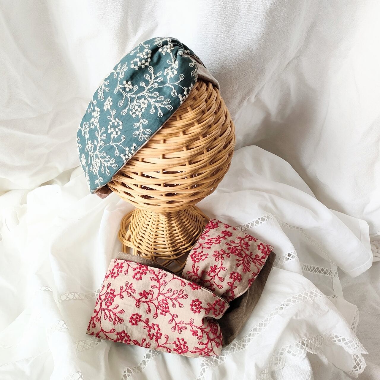 刺繍生地をあしらったヘアバンド。肌ざわりのやさしいコットンリネンを重ねてターバンのような立体的なデザインに仕上げました。細かい部分は手縫いで丁寧に仕上げています。