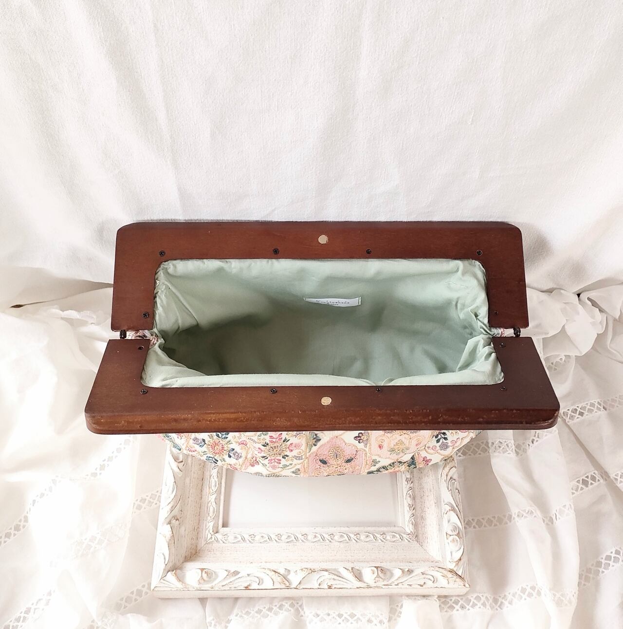 こちらのクラッチバッグはオフホワイトのシルク地にモーヴピンクやブルーグレー、セージグリーン、くすみパープルなどの透明感あるパステル系の糸と、ギラギラでなく品良く輝くゴールドの糸で全面にぜいたくな刺繍がほどこされています。