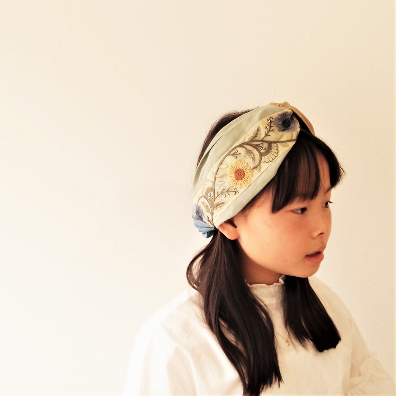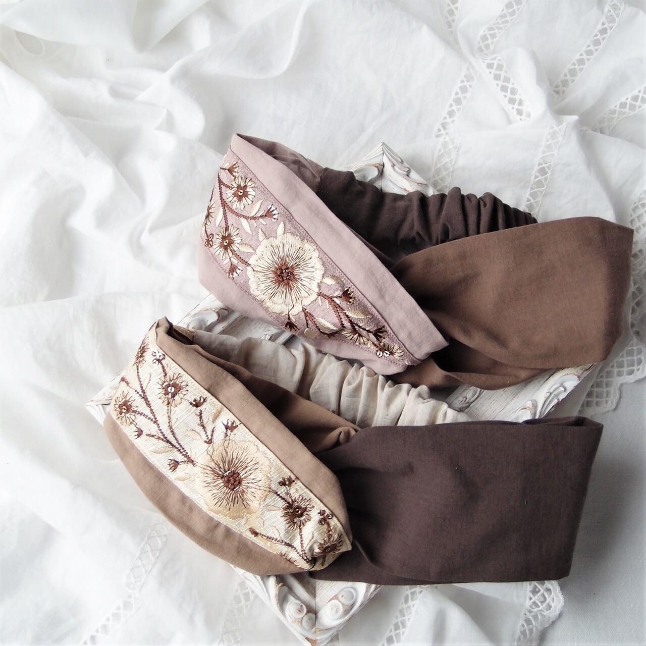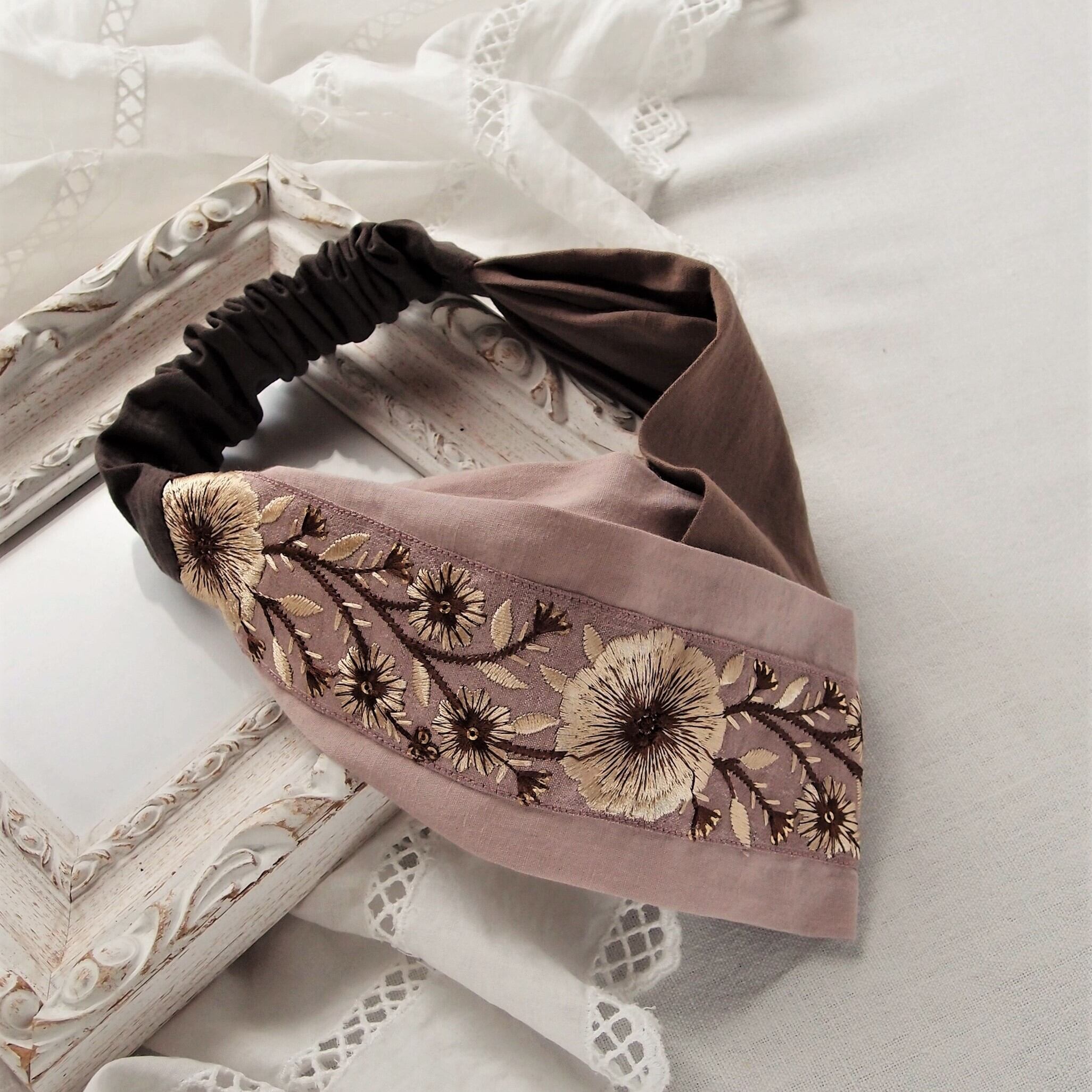 インド刺繍リボンをあしらったヘアバンド。肌ざわりのやさしいコットンリネンを重ねてターバンのような立体的なデザインに仕上げました。細かい部分は手縫いで丁寧に仕上げています。