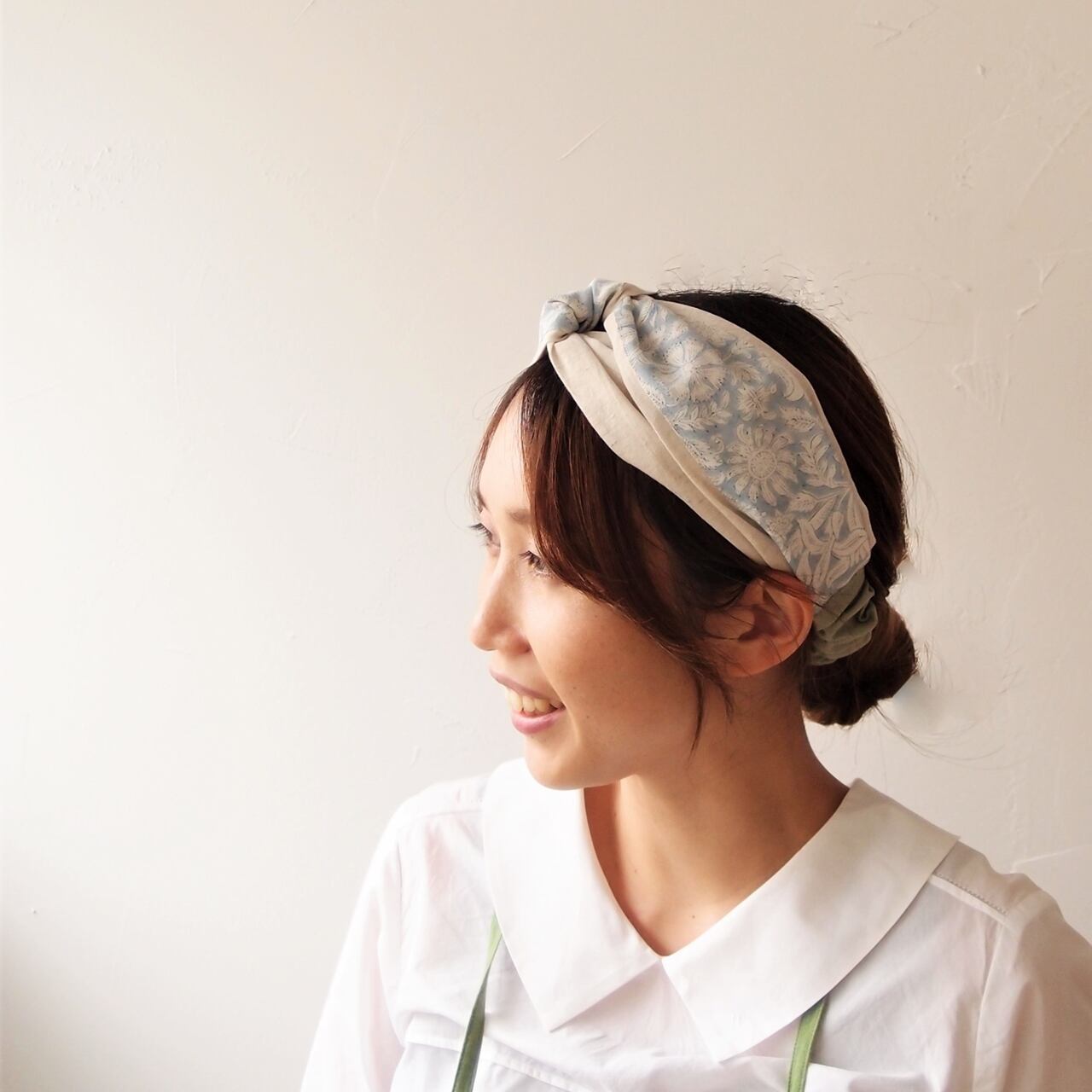 インド刺繍リボンをあしらったヘアバンド。肌ざわりのやさしいコットンリネンを重ねてターバンのような立体的なデザインに仕上げました。細かい部分は手縫いで丁寧に仕上げています。