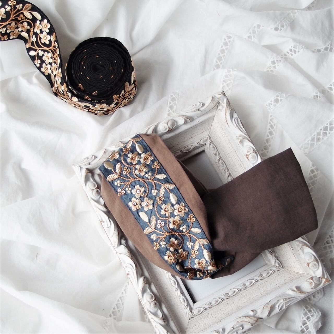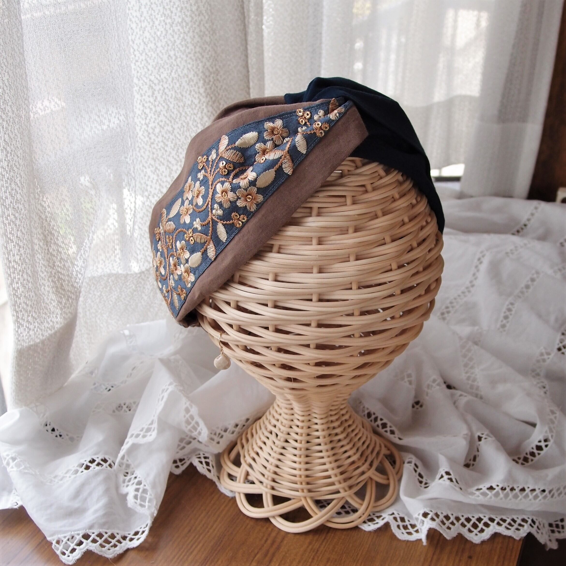 インド刺繍リボンをあしらったヘアバンド。肌ざわりのやさしいコットンリネンを重ねてターバンのような立体的なデザインに仕上げました。細かい部分は手縫いで丁寧に仕上げています。