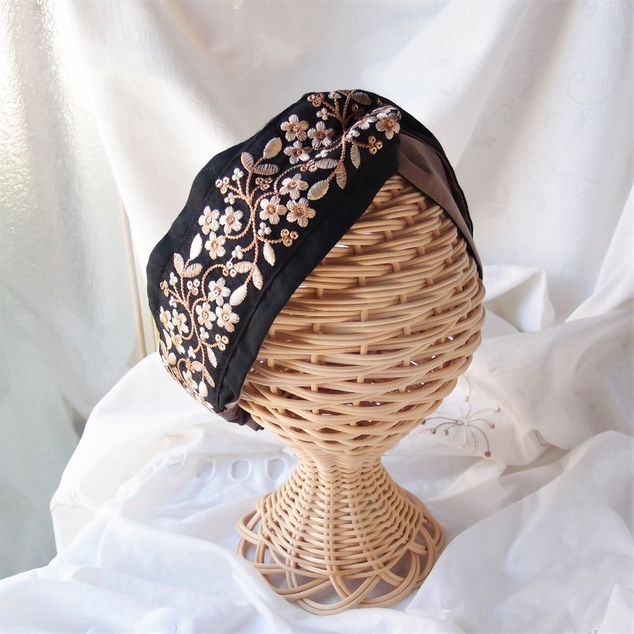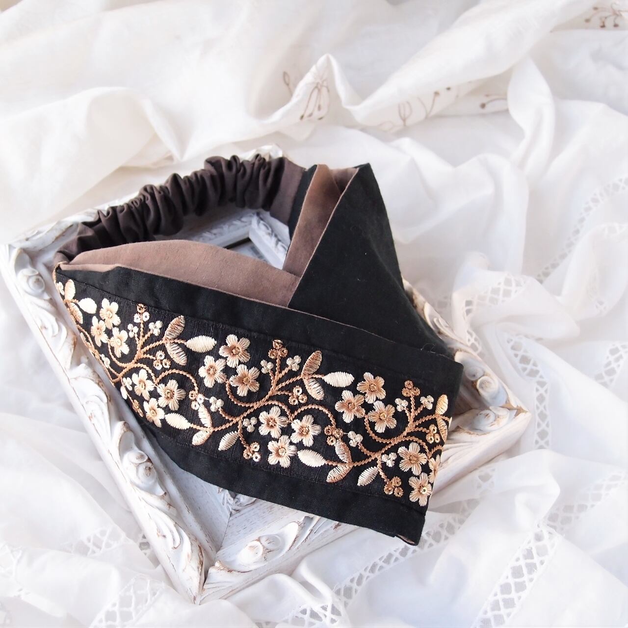 インド刺繍リボンをあしらったヘアバンド。肌ざわりのやさしいコットンリネンを重ねてターバンのような立体的なデザインに仕上げました。細かい部分は手縫いで丁寧に仕上げています。